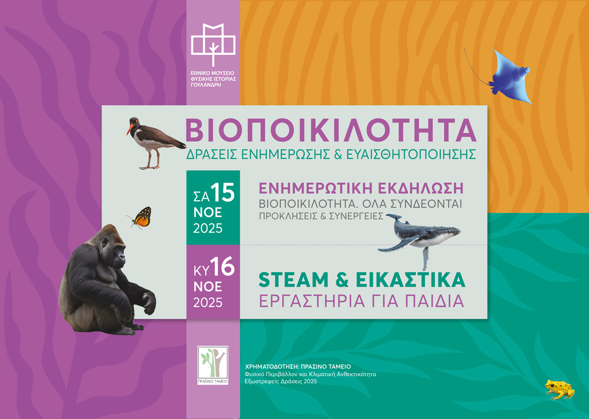 Το Εθνικό Μουσείο Φυσικής Ιστορίας Γουλανδρή διοργανώνει στις 15 & 16 Νοεμβρίου 2025 διήμερο εκδηλώσεων για τη βιοποικιλότητα, στο πλαίσιο του Χρηματοδοτικού Προγράμματος του Πράσινου Ταμείου «Φυσικό Περιβάλλον και Κλιματική ανθεκτικότητα 2025 – Οικονομική Υποστήριξη Εξωστρεφών Δράσεων 2025».